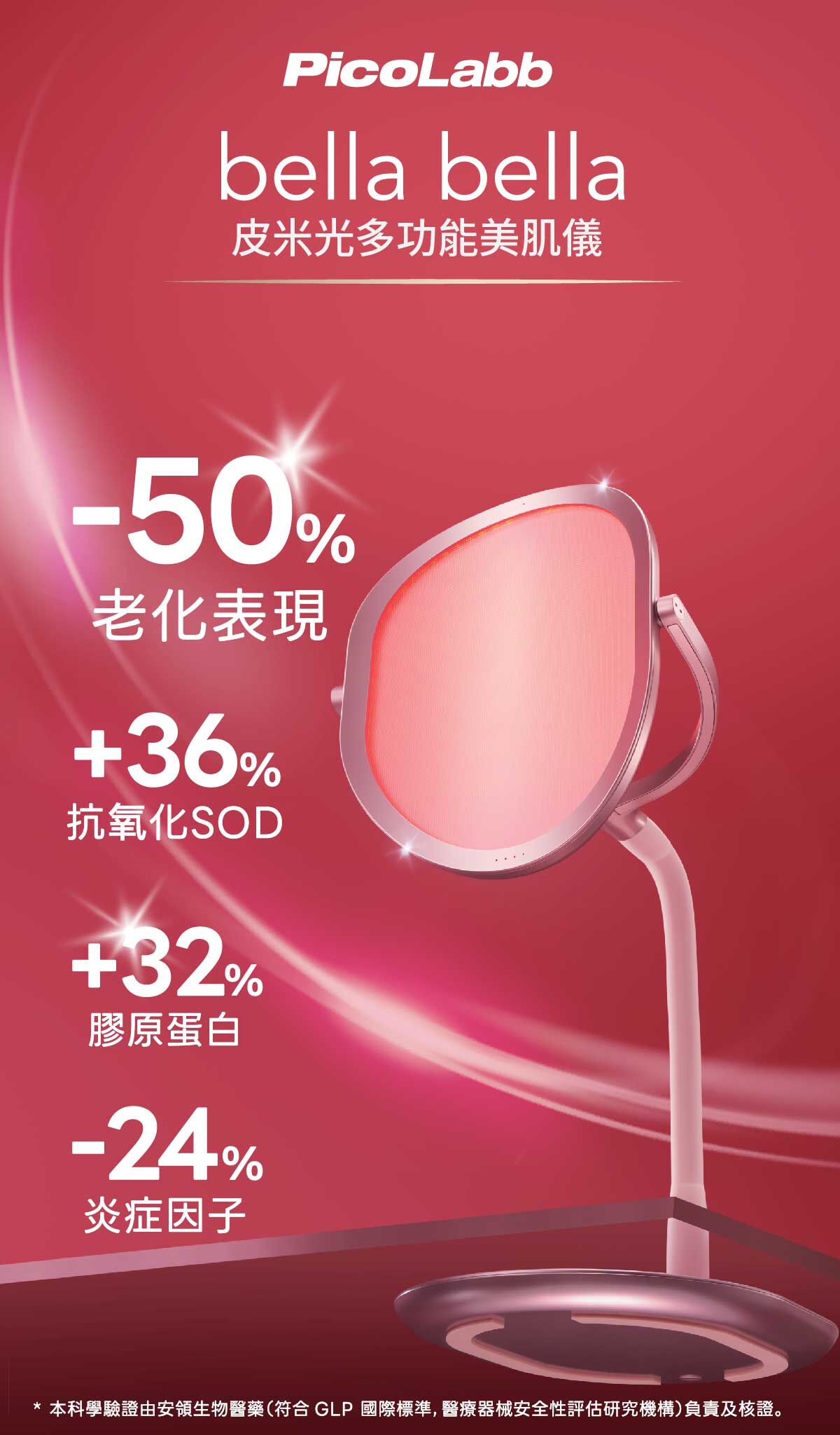 PicoLabb bella bella皮米多功能美肌儀,特有「PVA皮米技術」高科技美肌芯片,提供媲美醫美級的居家護膚體驗。每日只需24分鐘助您實現去紋,緊緻、亮澤、均勻膚色等6大美肌效果,經安領生物醫藥測試認可有效抗衰老,讓您無懼30+ 、40+、50+年齡數字,隨時散發自信光彩。
